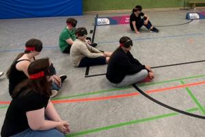 Sitzball blind spielen, wo alle nur ihren Namen rufen und der Ball die geräuche macht.
