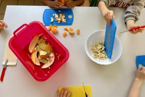 Hallo - hier ist die Klasse 1 und 2 an der Schule und im Unterricht angekommen.Wir lernen fleißig und schreiben schon die Buchstaben O M A. Im Sachunterricht sind wir auf den Spuren des Herbstes und entdeckten die Natur. Wir fanden Walnüsse für unseren Salat. Heute wurde in der Lernküche viel Obst geschnitten und das Ergebnis: Obstsalat mit Walnüssen.
